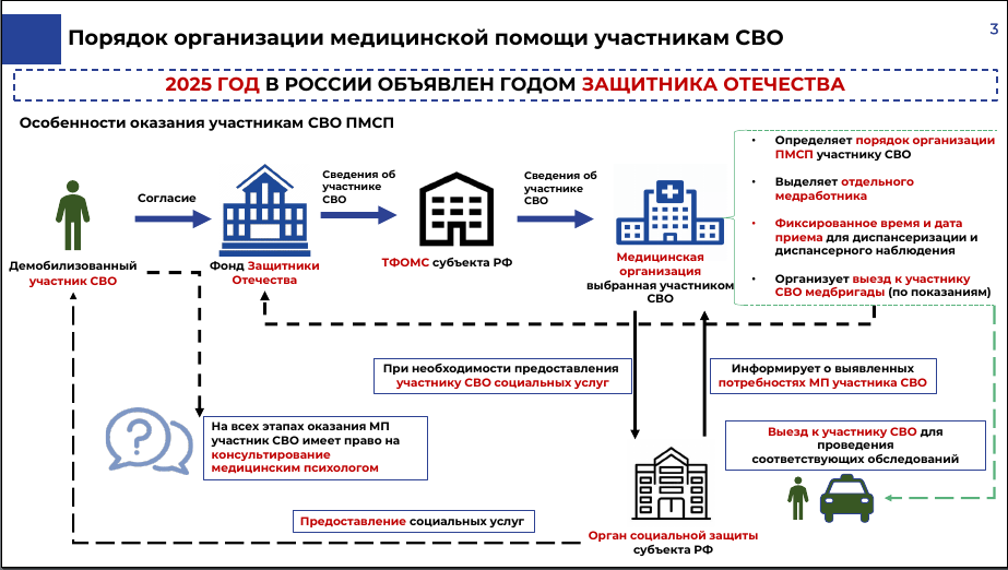 В рамках объявленного Президентом России Года Защитника Отечества в Программе госгарантий утверждён особый порядок оказания медицинской помощи отдельным категориям ветеранов боевых действий. Получить её могут демобилизованные участники СВО.