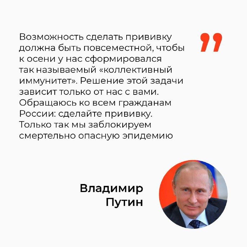 21 апреля Президент России обратился к Федеральному собранию с ежегодным посланием. Одной из первых тем стала борьба с коронавирусом. Вакцинации Владимир Путин уделил особое внимание. Глава государства нацелил федеральный минздрав, правительств и глав регионов на то, чтобы пройти иммунизацию могли все желающие.